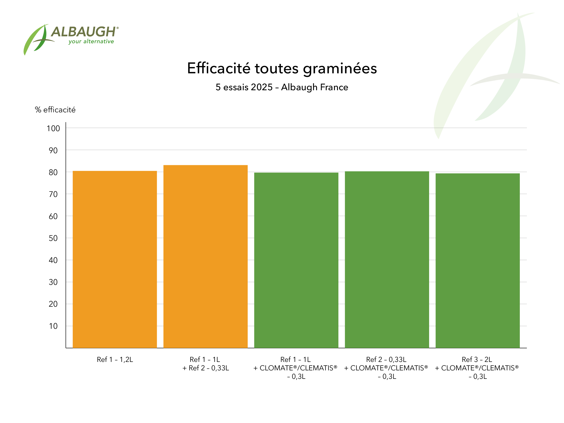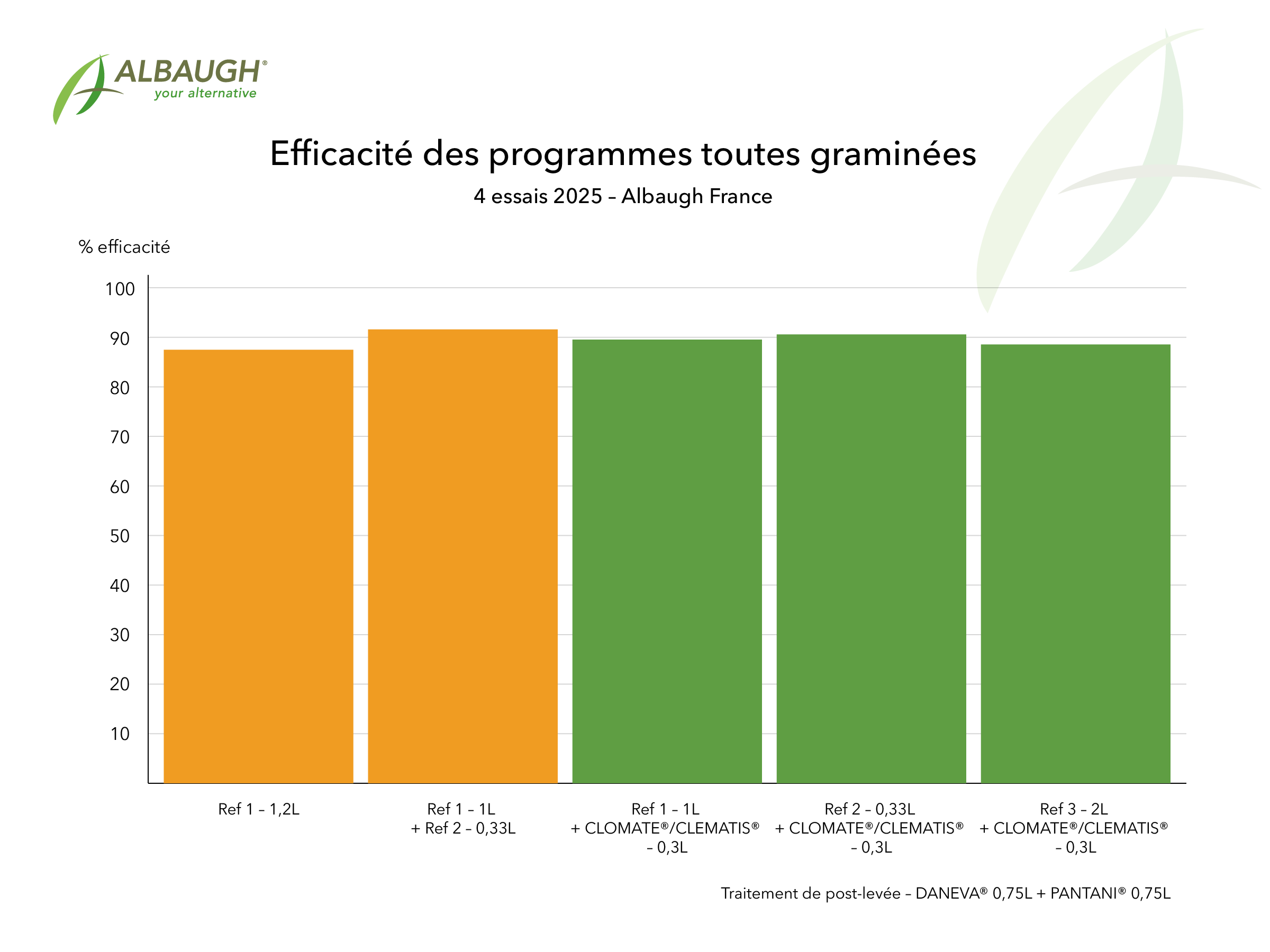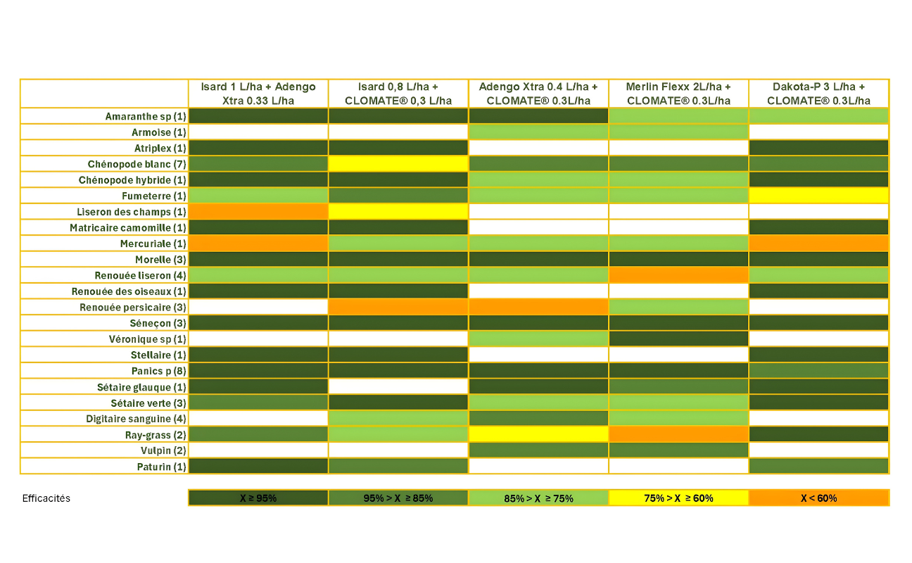 Les efficacités sur graminées dans les essais montrent que CLOMATE®/CLEMATIS® peut s’intégrer dans des stratégies avec ou sans DMTAP tout en conservant des efficacités satisfaisantes.