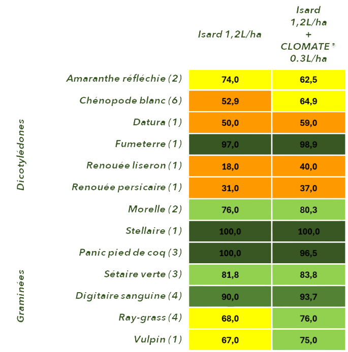 CLOMATE® peut particulièrement jouer ce rôle de partenaire polyvalent, dans un premier temps car la clomazone possède un spectre anti-dicotylédones large, auquel s’ajoutent des efficacités sur graminées estivales (Panics, Sétaires, Digitaire) et graminées automnales (Ray-grass, Vulpins) intéressantes pour compléter les efficacités des solutions associées. Mais également dans un second temps, CLOMATE®, ne possède aucune classification contraignante vis-à-vis de la directive mélange le rendant compatible avec toutes les solutions disponibles en pré-levée.